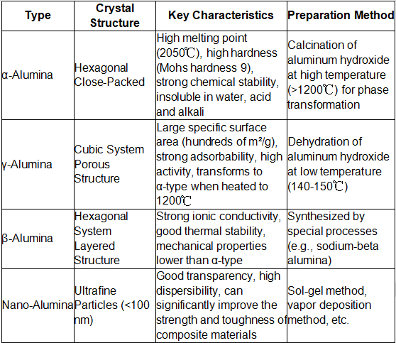 Alumiiniumoksiidi pulbri põhiklassifikatsioon põhineb selle kristallstruktuuril ja valmistamisprotsessil. Levinud tüübid ja nende omadused on järgmised: